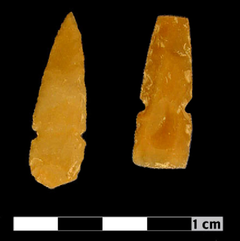 Lithic: Group shot of projectile points from various zones within Op. 8. Top row: LT# 0072, LT# 0015, and LT# 0014. Bottom row: LT# 0013 and LT# 0073.