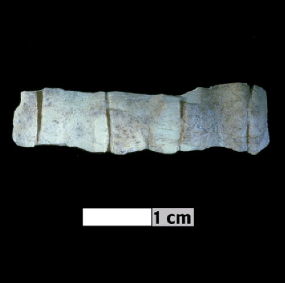 Fragment of a long bone carved with circumferential bamboo-like incisions.