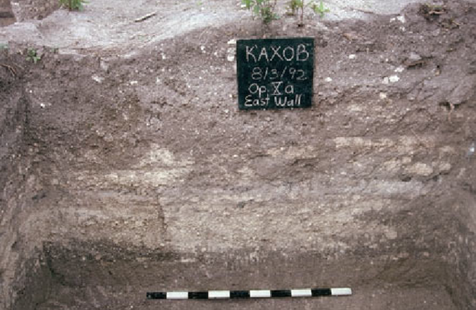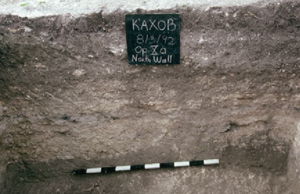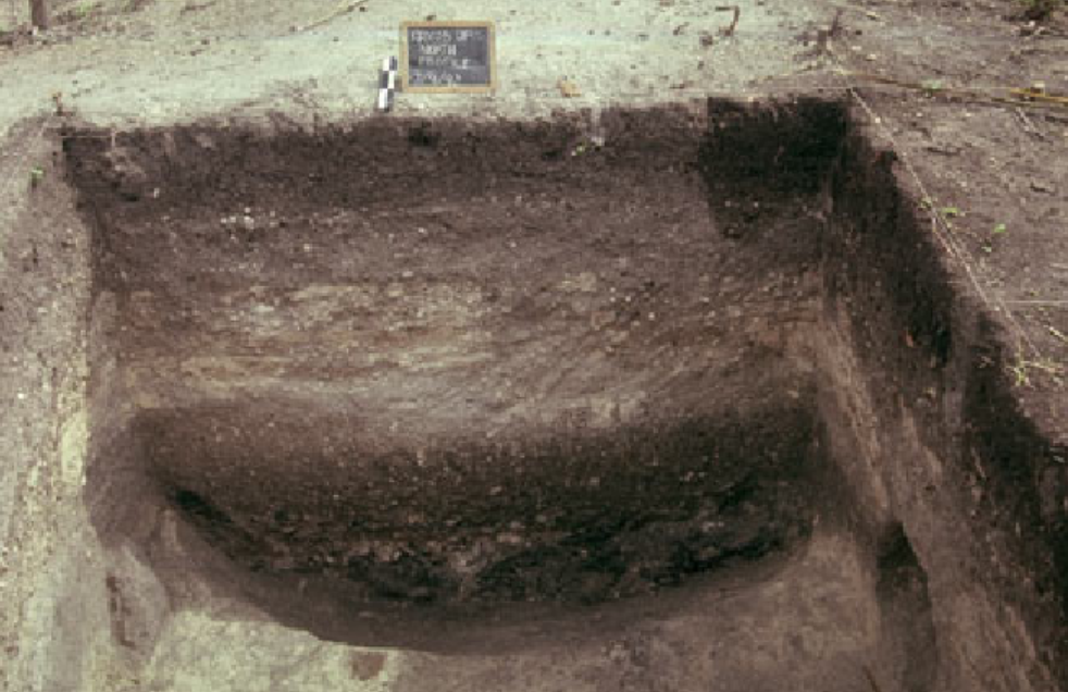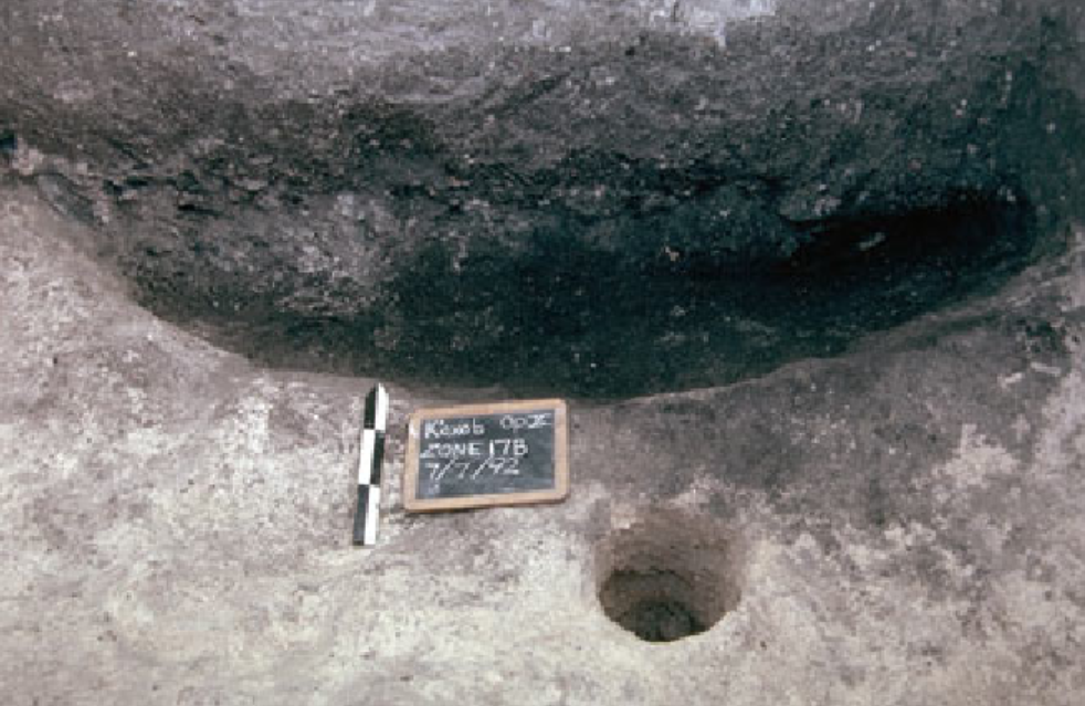 Construction Phase 1a showing fire pit in cross section and Zone 27 posthole (view to north).