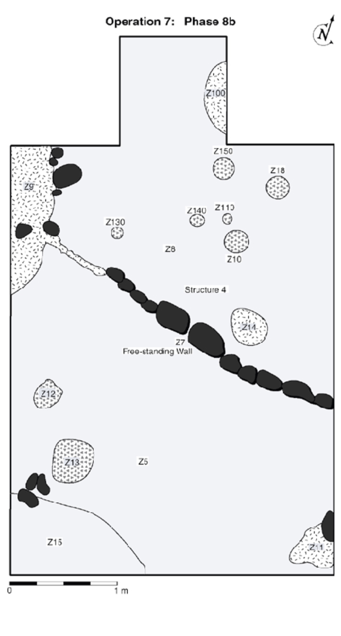 Construction Phase 2 after the pottery associated with Burials 13-1 and 13-2 were exposed but before the upper wall feature of Phase 3 had been removed, view to the east (note incorrect orientation of north arrow).