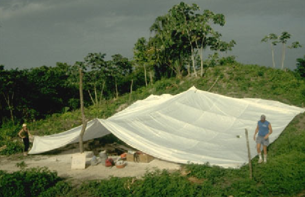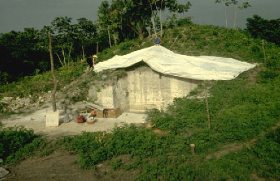 Construction Phases 9 & 10: Excavation in progress of Burial 1-2 (left) by Lorren Jackson. On the right, the circular shape of Zone 15 (Burial 1-1) can be seen as well as inverted Vessel No. 021 that capped the primary, seated interment (Burial 1-1a).