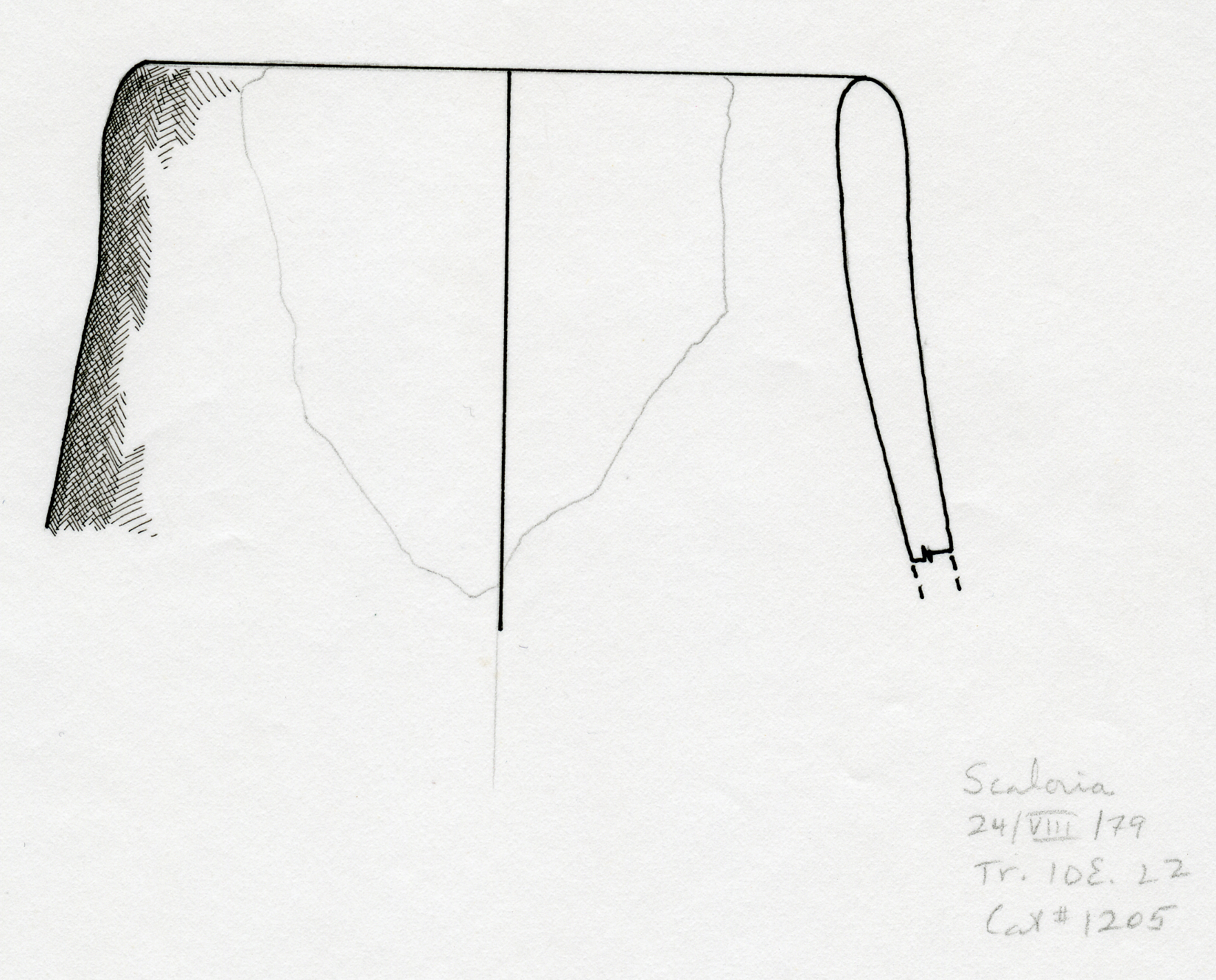 reconstruction of rim in drawing from sherd Keywords: 10; 2; East; level; pottery; reconstruction; sherd; trench; sketch; drawing