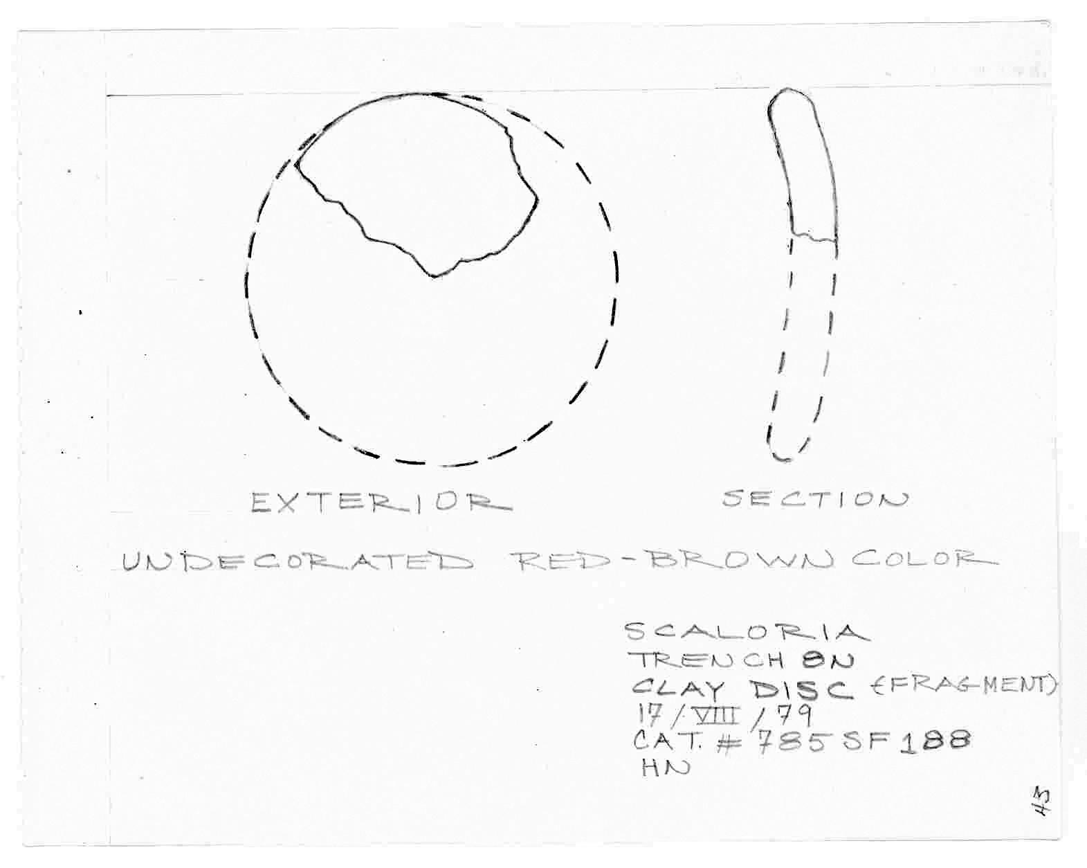 clay disc fragment, undecorated red-brown color. Keywords: 8; N; brown; clay; drawing; fragment; north; pottery; red; sherd; sketch; trench