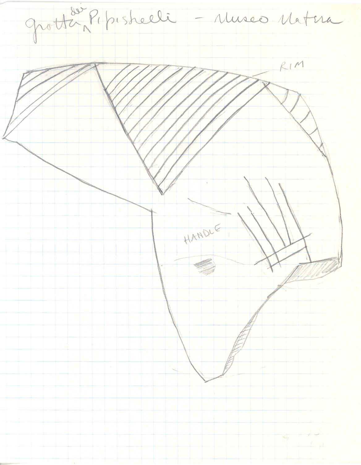 Grotta dei pipistrelle- Museo Matera, Rim/handle sherd Keywords: clay; drawing; handle; matera; museo; museum; pottery; rim; sherd; sketch; trench
